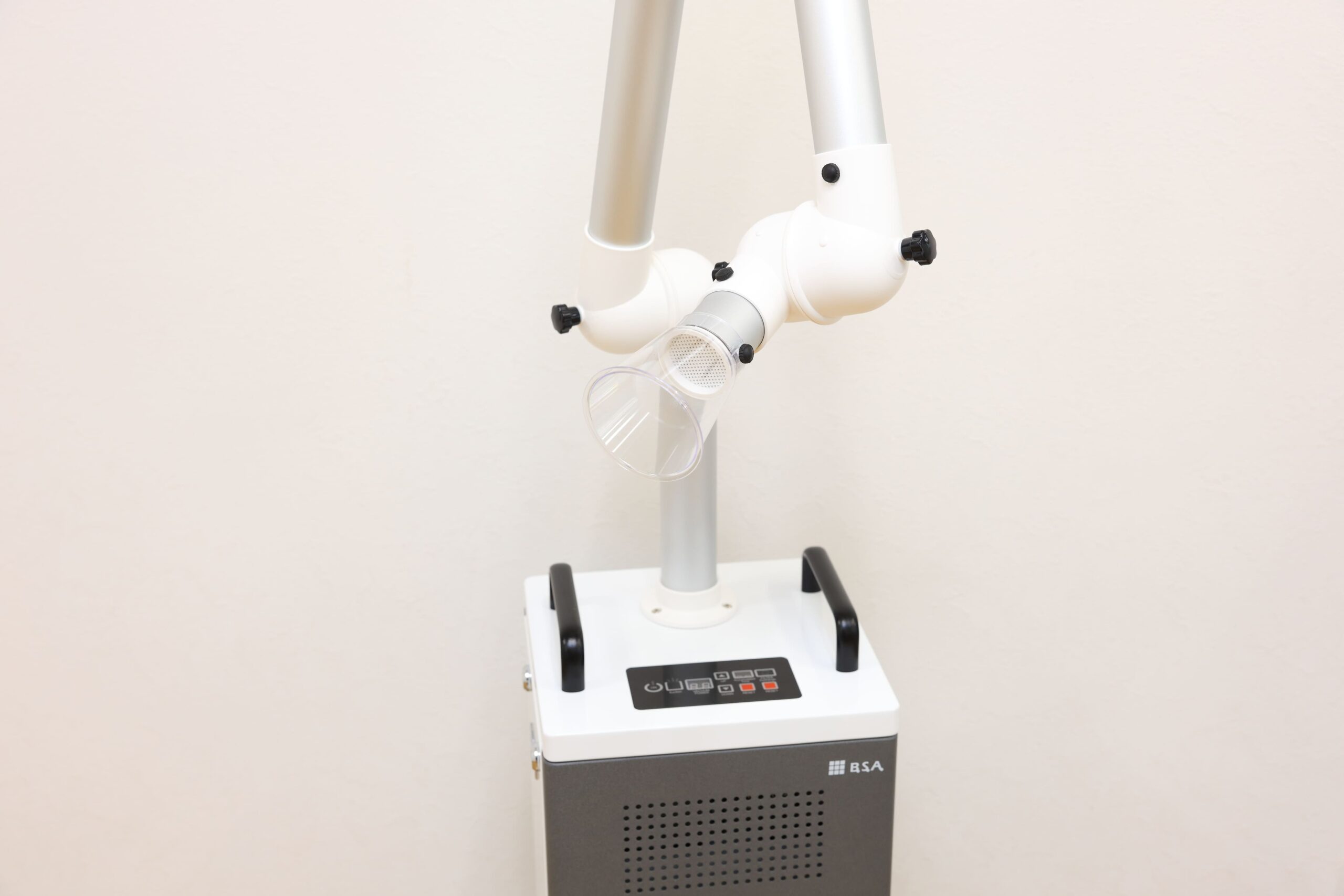 当院では、すべての患者様に安心して歯科治療を受けていただけるよう、徹底した院内感染対策を実施しています。まず、待合室および診療室には空気清浄機「Airdog(エアドッグ)」と除菌脱臭機「バクテクターO3」を導入しています。 エアドッグは空気中のウイルスや微粒子を99.9%除去し、加えてニオイの原因物質も除去します。 バクテクターO3は、空気中に含まれる菌・ウイルス・ニオイの成分を強力に分解・除去することで、より清潔な空間を維持します。 治療時には、口腔外バキュームを使用し、治療中に飛散する唾液・血液・歯の削りかす・粉塵などを患者様の口元付近で強力に吸引。飛沫の拡散を防ぎ、診療室内の衛生状態を保っています。