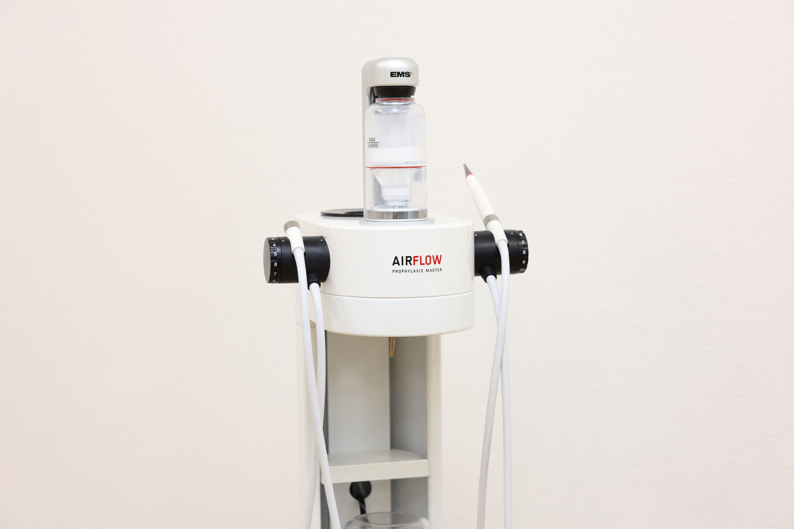 エアフローという専用機器を使用し、水と微粒子パウダーをジェット噴射して、バイオフィルムやステイン(着色汚れ)、柔らかい歯石などをやさしく取り除きます。歯面を傷つけることなく、自然なツヤを取り戻します。